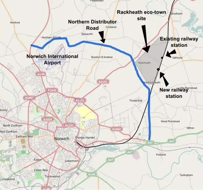 The development is actually just to the north of a new proposed dual carriageway, the Norwich Northern Distributor Road which has also been subject to sustained opposition[33] which would link the new-town to Norwich International Airport and the A47 road.