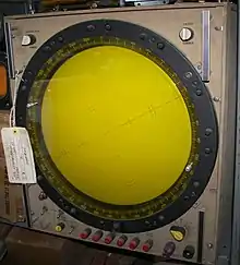 The PPI display provides a 2-D "all round" display of the airspace around a radar site. The distance out from the center of the display indicates range, and the angle around the display is the azimuth to the target. The current position of the radar antenna is typically indicated by a line extending from the center to the outside of the display, which rotates along with the antenna in realtime.[1] It is essentially a B-scope extended to 360 degrees. The PPI display is typically what people think of as a radar display in general, and was widely used in air traffic control until the introduction of raster displays in the 1990s.