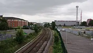 In 1870 the Midland Railway approved the construction of the Radford to Trowell line which started at a junction just north of Radford station.[3] Along with the Ambergate to Codnor Park line constructed at the same time, its purpose was to route Lancashire freight traffic via Nottingham to avoid the bottleneck of Derby.[4] The line was nearly 5 miles in length and the contractor was Messrs Eckersley and Bayliss of Derby.[5] Some labour force issues[6] delayed completion of the line until 1874.[7] It formally opened on 1 May 1875.[4] and also served Wollaton Colliery and later Trowell Moor Colliery.
