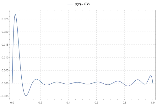Choosing , the Gaussian, with a shape parameter of , we can then solve the matrix equation for the weights and plot the interpolant. Plotting the interpolating function below, we see that it is visually the same everywhere except near the left boundary (an example of Runge's phenomenon), where it is still a very close approximation. More precisely the maximum error is roughly at .