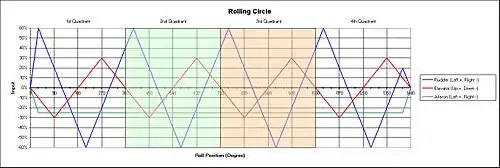 Below is a graph that illustrates the elevator and rudder input as a function of rolling position during one turn quadrant. For this case, 60° rudder phase lead and 90° elevator phase lead are used. Actual amplitude and phase leads may vary depending on aircraft behavior.