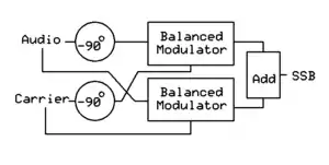 These audio outputs are each mixed in a linear balanced mixer with a carrier. The carrier drive for one of these mixers is also shifted by 90°. The outputs of these mixers are added in a linear circuit to give the SSB signal by phase cancellation of one of the sidebands. Connecting the 90° delayed signal from either the audio or the carrier (but not both) to the other mixer will reverse the sideband, so either USB or LSB is available with a simple DPDT switch.