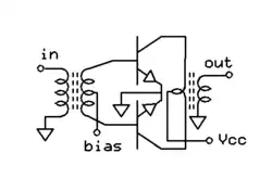 A push-pull frequency tripler. The output is tuned to three times the input frequency.