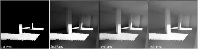 Another common method for solving the radiosity equation is "shooting radiosity," which iteratively solves the radiosity equation by "shooting" light from the patch with the most energy at each step. After the first pass, only those patches which are in direct line of sight of a light-emitting patch will be illuminated. After the second pass, more patches will become illuminated as the light begins to bounce around the scene. The scene continues to grow brighter and eventually reaches a steady state.