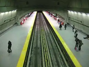 Designed by Papineau, Gérin-Lajoie, Le Blanc, Edwards, it is a normal side platform station built partly in tunnel, with a very tall, vaulted volume over the eastern part of the platform. This contains the transept and a tall escalator shaft rising unsupported to the ticket hall above. The latter gives access to three entrances. The station serves a metropolitan bus terminus and a park and ride lot.