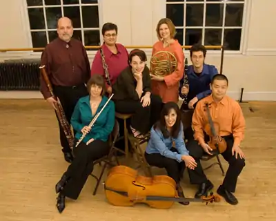 Left to right: Gregory Newton (bassoon), Sarah Brady (flute), Jennifer Montbach (oboe), Sarah Bob (piano), Anne Howarth (horn), Miriam Bokosky (violoncello), Eran Egozy (clarinet), Jae Young Cosmos Lee (violin).