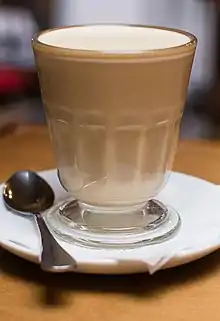 Raf or raf coffee is a popular coffee drink in Russia and the countries of the former USSR, which appeared in the late 1990s. Prepared by adding cream and vanilla sugar to a single shot of espresso and then foaming the mix with a steam heater. The main differences from latte are the use of vanilla sugar and cream instead of milk and the fact that the whole mix is foamed together instead of just milk. Syrup is often used instead of vanilla sugar.[1]
