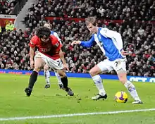 On 27 October 2009, Fábio, Rafael's twin brother, was booked for a foul committed by Rafael in United's 2–0 League Cup victory over Barnsley.[20] Manchester United appealed and The FA agreed it was a case of mistaken identity, transferring the card over to Rafael.[21] On 30 December, Rafael scored the second goal of his Manchester United career and the first at Old Trafford in a 5–0 league win over Wigan Athletic.[22] On 7 April 2010, Rafael was sent off for the first time in his United career, receiving two yellow cards either side of half-time against Bayern Munich in the second leg of the Champions League quarter-final tie.[23] Despite United winning the game, they were eliminated from the competition due to the away goals rule when the aggregate score was 4–4.[24] Despite this red card, Sir Alex Ferguson praised Rafael for his performance and stated that "he absolutely dominated Franck Ribéry".[25]