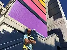 Identity and human expression are relentlessly present in his pieces, as is the case with the “Sierra Hall”[33] mural on the University of Nevada, Reno campus. In July 2020, Blanco painted a seven-story mural on the Sierra Hall building facing Virginia Street.[34] On the left side of the mural, six sets of human eyes[5] are painted horizontally in a swath of rainbow stripes, representing different races, ages, ethnicities and sexual orientation. The eyes of Colin Kaepernick are represented at the top. On the center column, Blanco painted his own version of a clenched fist that is a symbol of resistance and defiance against social and racial injustices.[4] To the right of this, continues the colorful horizontal stripes with a quote by Audre Lorde that reads, “It is not difference which immobilizes us, but silence.”