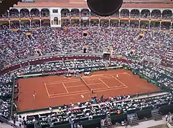 National and international representationDavis Cup![]() Nadal plays Andy Roddick at the Las Ventas bullring in Madrid, Spain during the 2008 Davis Cup semifinals. A clay court was specially constructed within the arena for the event.[40] Nadal played with La Armada in 2004, 2005, 2006, 2008, 2009, and 2011 winning the trophy in 2004, 2008 and 2009, as well as in 2011 and 2019 and fighting to remain in the World Group in 2005 and 2006. He was not able to play the final of the 2008 Davis Cup due to an injury of his left knee but he later received a replica of the cup given to the members of the Spanish team which played in Argentina, being David Ferrer, Marcel Granollers, Feliciano López and Fernando Verdasco. Finals (4–0)