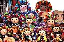 Motanka dolls (Polish motanka, Ukrainian мо́танка, from motać/мотати - to tangle/spool) are a type of traditional amulet dolls made in Poland, Ukraine, Belarus and Russia.[5] They were a part of folk culture (Vasilisa the Beautiful) and its magical beliefs, made and tied without the use of a needle or other sharp objects, to "not poke/hurt the fate" and traditionally had no facial features, sometimes with a cross instead.[5] Motanka dolls were made with specific intentions and wishes/tasks for them to grant, of various sorts, such as guarding the family or a prosperous marriage. Nowadays motanka dolls are coming back to popularity as a part of interest in Slavic cultures of the past, often as an educational device during educational and ethnographic workshops, or as a work of folk artists.[5][6]