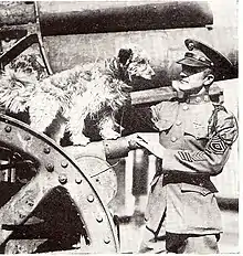He was adopted into the 1st Division on July 14, 1918, in the Montmartre section of Paris, France. Rags remained its mascot until his death in Washington, D.C. on March 22, 1936.[2] He learned to run messages between the rear headquarters and the front lines, and provided early warning of incoming shells. Rags achieved great notoriety and celebrity war dog fame when he saved many lives in the Meuse-Argonne Campaign by delivering a vital message despite being bombed, gassed and partially blinded.[3] His adopted owner and handler, Private James Donovan, was seriously wounded and gassed, dying after returning to a military hospital at Fort Sheridan in Chicago. Rags was adopted by the family of Major Raymond W. Hardenbergh there in 1920, moving with them through several transfers until in Fort Hamilton, New York, he was reunited with members of the 18th Infantry Regiment who had known him in France.[4] Rags was presented with a number of medals and awards.