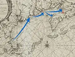 The force Church raised consisted of about 500 volunteers from coastal areas of Massachusetts, including some Indians.[16] He left Boston on 15/26 May with fourteen transports and three warships. The warships include the Royal Navy vessels HMS Adventure,[17] HMS Jersey (42 guns) and HMS Gosport (32),[18] which were also accompanied by the Massachusetts ketch Province Galley under Cyprian Southack's command.[19] (Church took a former prisoner of the Maliseet, John Gyles as his translator.)[20]
