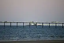 Bemo Rail of Warmenhuizen in the Netherlands laid the track onto the pier for transporting workers and equipment to the platform, which is 4 km away from the coastline, at which tankers can be filled with LNG, because they cannot come closer to the coast because the water is very shallow. Bemo also supplied two battery operated rail vehicles made in 1993 and 1997/98, as well as a motorless passenger car and some flat cars for tools. The locomotives get their energy from batteries and are explosion proof, for instance with stainless steel wheels. They can transport 10 passengers each. The original description was RCE-15 (Rail Car Electric, 15 kN (1,5 t) pulling force). Now it has been renamed to BRE-15 (Bemo Rail Electric). The maximum speed ist 15 km/h. In 1999 the first locomotive was equipped, similarly to the second locomotive, with an AC asynchron motoro instead of the DC motor.[14] Two older explosion proof rail cars and trailers were delivered by Alan Keef in England.[15][16][17][18][19]