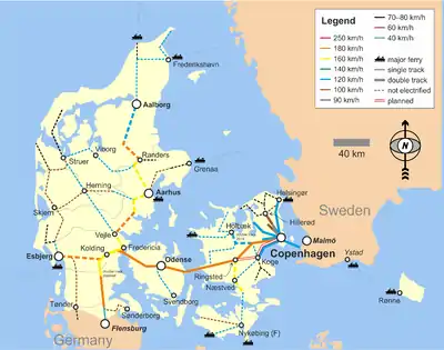 - For details, see the map at "Kort over jernbanenettet - Maksimal hastighed", Banedanmark. (PDF file available.)