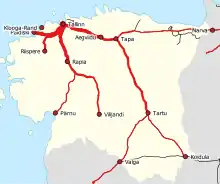 - Tallinn–Lelle–(Pärnu)–(Mõisaküla), 141.4 km (87.9 mi) (formerly 190.0 km). There was an international connection from Mõisaküla to Latvia, but the stretch Pärnu–Mõisaküla was abandoned in 2008.[8][9] The Lelle-Pärnu section was permanently closed for passenger operations on 9 December 2018 as it required a €17 million refurbishment. A rail service to Pärnu station will be resumed with the opening of the Rail Baltica line.[10][11]
