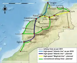 The national railway-operator ONCF is working on several projects. The largest project is a high-speed railway from Tangier via Rabat and Casablanca to Marrakech. Also a (passenger) rail connection between Tangier and Tangier MED, the port on the Mediterranean near Tangier, will give passengers arriving by ferry a connection to the main lines. A train will operate every 2 hours between the port and Tangier city.[13] A freight-line from the Renault factory at Tangier MED is already operational[14] The Marrakech to Agadir railway is also planned to be completed by 2025,[15] becoming the first rail line to reach the southern Souss-Massa region.