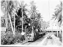 The railway at Aiwo jetty was electrified in 1912, but replaced by a conveyor belt between the storage bins and the jetty head.[1]