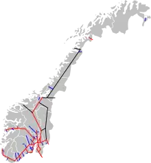 | Bergen Line | Hønefoss | Bergen | 371 km | Electric | 1909-12-01 | Operated route Oslo S–Drammen–Bergen (495 km) |