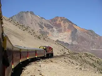 The Central Railway, Ferrocarril Central del Perú (FCC), incorporates the first railway in Peru opened on May 17, 1851, linking the Pacific port of Callao and the capital Lima (13.7 km (8.5 mi) of standard gauge).[5] This was expanded to form the Callao, Lima & Oroya Railway, opened to Chicla by 1878, the original contractor being Henry Meiggs and engineer being Ernest Malinowski assisted by Edward Jan Habich. The line reached La Oroya by 1893 and Huancayo (346 km (215 mi)) in 1908.[6] It is the second highest railway in the world (following opening of the Qingzang railway in Tibet), with the Galera summit tunnel under Mount Meiggs at 4,783 m (15,692 ft) and Galera station at 4,777 m (15,673 ft) above sea level, requiring constructional feats including many switchbacks and steel bridges. Since 1999 it has been operated as the Ferrocarril Central Andino (FCCA) (with its associated maintenance company Ferrovias Central Andina (FVCA)) by the Pittsburgh-registered Railroad Development Corporation.[7] There is no regular passenger traffic but excursions are operated from the Lima Desamparados station.[8] In April 1955 the Central Railway opened a spur line from La Cima on the Morococha branch (4,818 m (15,807 ft) above sea level) to Volcán Mine, reaching an (at the time) world record altitude of 4,830 m (15,850 ft). Both branch and spur have since closed to traffic.[9]