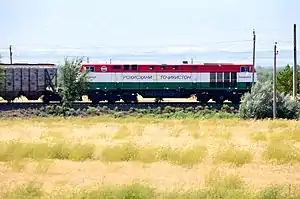 Rail transport in Tajikistan is limited, as the railroad system totals only 680 kilometres (420 mi) of non-electrified, single-track railway,[1] all of it 1,520 mm (4 ft 11+27⁄32 in) broad gauge. The system connects the main urban centres of western Tajikistan with points in neighboring Uzbekistan. In 1999 a new line connected the southern cities of Bokhtar and Kulob. In 2016, another line connected both cities to the capital Dushanbe, thus linking southern and central railway networks together.[2] The northern branch around Khujand remains physically disconnected from this main Tajik railway network, accessible only through a lengthy transit via Uzbekistan. As of 2017, the passenger service remains limited to infrequent international trains from Dushanbe and Khujand to Moscow, one weekly train from Dushanbe to Khujand (via Uzbekistan) as well as a local service between Dushanbe and Pakhtaabad (daily) and Kulyob/Shahrtuz (twice weekly).