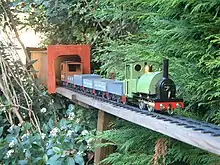 Ridable, outdoor gauge, named according to the gauge in inches, and scale in inches per foot, for example 7+1⁄4 in (184 mm) gauge, 1.5 inch scale. The gauge is 7+1⁄2 in (190.5 mm) in the US and Canada, where the scale sometimes is 1.6 inch for diesel-type models. Private and public (club) tracks exist in many areas. Among is them the world's largest model railroad: Train Mountain Railroad,[1] with over 25 miles (40 km) of tracks. Powerful locomotives can pull 50 or more passengers. Narrow-gauge models in this gauge can be as large as 1:3 scale. | ![]() |
