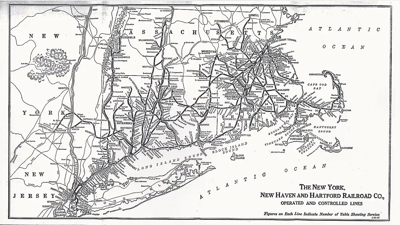 1872 saw the formation of the New York, New Haven and Hartford Railroad, created by the merger of the New York and New Haven and the Hartford and New Haven.[13] The New Haven began to acquire various other railroads in southern New England over the next decades.[3]