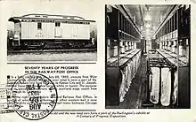 As the development of passenger cars progressed, so too did the development of RPO cars. The first plans for RPO car designs were based on light baggage car frames and bodies, which sometimes resulted in catastrophe for RMS employees when the trains were involved in accidents. From 1900 to 1906 some 70 workers were killed in train wrecks while on duty in the RPOs, leading to demands for stronger steel cars.[14] The RMS developed its first standards for car design in 1891 to address some of these issues.[15] In 1912, the Railway Mail Service developed a set of strength requirements for new cars in an effort to push the car building companies into using steel for the cars' major structural components and underframes. The core of the requirements was that each car should be able to withstand a buffer force of at least 400,000 pounds. This requirement was doubled to 800,000 pounds in a 1938 revision of the standards. The requirements were again strengthened in 1945 with specifications that precluded the use of aluminium for framing and major structural components. The 1945 revisions also included a requirement for end posts to prevent telescoping in the event of a collision. Car manufacturers adopted these requirements and carried them through to all other models of passenger cars that they built.[16] The 800,000 lb buffer load and end post requirements were later adopted by the Interstate Commerce Commission (ICC) for all passenger MU locomotives as of April 1, 1956[17] and to all passenger cars and locomotives in 1999 by the USDOT.[18]