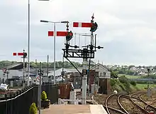 Somersault signals at Carrickfergus railway station, showing the distinctive central pivot about which the arm "somersaults"