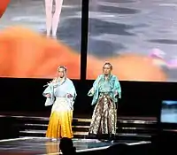 Fifteen years later, "Rain" was used as a video interlude for Madonna's Sticky & Sweet Tour. The song was remixed using elements of Eurythmics' 1984 hit "Here Comes the Rain Again" and featured the Japanese dancing duo Hamutsun Serve. The video featured a pixie finding shade under a petal during a rainstorm and witnessing the transformation of a caterpillar into a butterfly.[60][61] This performance was included on the Sticky & Sweet Tour live CD and DVD release, recorded during Madonna's shows in Buenos Aires, Argentina, in December 2008.[61] In 2000, British gothic rock band Rosetta Stone covered "Rain" for Madonna's tribute album, Virgin Voices: A Tribute to Madonna, Vol. 2.[62] The following year, a hi-NRG/Eurodance cover by Who's That Girl! was released through Almighty Records.[63] In 2016, Madonna's former backup singers Niki Haris and Donna De Lory covered "Rain" and released it as a digital single. Their single release consists of the acoustic version and the Willie Ray Lewis remix version.[64]