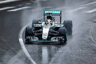 A rain tyre or wet tyre (spelt tire in American English, commonly shortened to wet) is a special tyre used in motorsport in wet weather as opposed to a slick tyre used in dry conditions. It is very similar in many ways to the tyres found on normal road cars.[1]