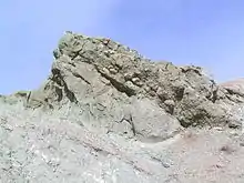 Above this is the Pickhandle Formation. The sediments making up this formation are mostly of volcanic origin – tuff, rhyolite and andesite (Dibblee 1967:84), indicating that they were laid down during a period of active volcanism. That time was probably during the early Miocene (Dibblee 1968:23).