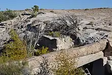 The park's earliest human inhabitants arrived 13,000 years ago.[9] These Clovis-era people are the ancestors of Native Americans.[10][11] By about 2,500 years ago Ancestral Pueblo farmers were growing corn and living in subterranean pit houses in what would become the park.[12] By one-thousand years ago Ancestral Pueblo farmers lived in above-ground, masonry dwellings called pueblos and gathered in large communal buildings called great kivas.[13] By AD 1450 Ancestral Pueblo farmers in the Petrified Forest migrated to join rapidly growing communities on the Hopi Mesas to the northwest and the Pueblo of Zuni to the east–these locations are still home to thousands of descendant community members today.[14] More than 1000 archeological sites, including petroglyphs, have been discovered in the park. These ancestral places remain important to descendant communities. In the 16th century, Spanish explorers visited the area, and by the mid-19th century a U.S. team had surveyed an east–west route through the area where the park is now located and noted the petrified wood.[15] Later, roads and a railway followed similar routes and gave rise to tourism and, before the park was protected, to large-scale removal of fossils. Theft of petrified wood remains a problem in the 21st century.