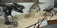 Much of the park’s petrified wood is from Araucarioxylon arizonicum, an extinct conifer tree, while some found in the northern part of the park is from Woodworthia arizonica and Schilderia adamanica trees. At least nine species of fossil trees from the park have been identified; all are extinct. The park has many other kinds of fossils besides trees. The Chinle, considered to be one of the richest Late Triassic fossil-plant deposits in the world, contains more than 200 fossil plant taxa. Plant groups represented in the park include lycophytes, ferns, cycads, conifers, ginkgoes, as well as unclassified forms.[22] The park has also produced one of the most diverse assemblages of fossil vertebrates from the Late Triassic. Among the groups represented are early theropod dinosaurs,[24][25] crocodile-line archosaurs,[26][27][28][29][30][31] temnospondyl amphibians,[32][33][34] lissamphibians,[35] non-archosauromorph diapsids,[36][37] and other dinosauromorphs[38][39] and archosauromorphs.[40][41] Dicynodonts are extremely rare despite being abundantly represented at the Placerias Quarry near St. Johns.[24][42] Fossil invertebrates include freshwater snails and clams.[43] The oldest fossil crayfish, Enoploclytia porteri, was also described from the park,[44] although it is not considered a crayfish proper (instead placed in Erymidae).