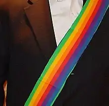 The Rainbow Sash itself is a strip of a rainbow-colored fabric which is worn over the left shoulder and is put on at the beginning of the Liturgy. The members go up to receive Eucharist.[16] If denied, they go back to pews and remain standing, but if the Eucharist is received then they go back to the pew and kneel in the traditional way.[17]