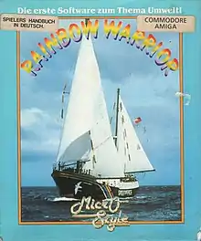 Rainbow Warrior is a video game for home computers produced by Greenpeace, developed in association with Source the Software House and published by MicroStyle in 1989. Versions were released for the Commodore 64,[1] Amiga[2] and Atari ST.[3] The game is a collection of mini-games which relate to Greenpeace's environmental campaigns and actions during the 1980s.[4][5] A printed booklet containing further information about the environmental campaigns accompanied the game. It was manufactured in the United Kingdom and claimed to be "the first environment friendly software". The game was officially launched aboard the Rainbow Warrior II with Doug Faulkner and Jonathan Smales representing Greenpeace.[6]