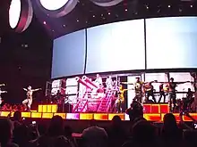 "Raining Men" was included on the set list of the Loud Tour in 2011.[30] The performance featured Rihanna in a camouflage inspired outfit, and was accompanied by dancers in the same attire who held pink rifles.[30] The set included a pink tank which was also present on the Rated R supported tour, Last Girl on Earth Tour (2010/11).[30] It began with Rihanna appearing on stage sitting on the pink tank as it was wheeled from the back of the stage to the front while Minaj's rap verse played; Rihanna then concluded the song with her vocals.[30] "Raining Men" was preceded by "Hard" and "Breakin' Dishes", and featured the singer wearing the same outfit and set design.[30] Minaj has also performed her verse on her Pink Friday: Reloaded Tour.