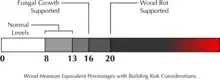 A normal range is 8–13% WME, with fungal growth beginning at the 16% threshold. A 20% WME is enough to promote wood rot.[24] It logically follows that the more time a part of a wall system exceeds one of these thresholds the greater chance of damage from fungal growth or rot.
