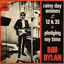 An edited version of "Rainy Day Women #12 & 35", lasting 2 minutes and 26 seconds, was released as a single on March 22, 1966, with "Pledging My Time" as the B-side.[28] The third and fifth verses were omitted, to make the duration more suitable for radio play.[28] The single entered the Billboard Hot 100 charts on April 23 and remained on the chart for nine weeks, pleaking at number two.[28] On May 12, the single entered the UK Singles Chart for the start of an eight-week run, where its highest placing was seventh.[28] It also appeared at number three in Canada,[29] and ninth in the Netherlands.[30] Blonde on Blonde, Dylan's seventh studio album, was issued as a double album on June 20, with "Rainy Day Women" and "Pledging My Time" as its first two tracks.[31][32] The album track has a duration of 4 minutes and 36 seconds.[33][34]