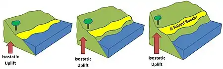 A raised shoreline is an ancient shoreline exposed above current water level.[1] These landforms are formed by a relative change in sea level due to global sea level rise, isostatic rebound, and/or tectonic uplift. These surfaces are usually exposed above modern sea level when a heavily glaciated area experiences a glacial retreat, causing water levels to rise. This area will then experience post-glacial rebound, effectively raising the shoreline surface.