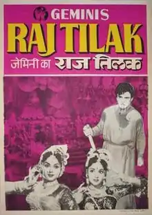 Raj Tilak (transl. Crown Prince) is a 1958 Indian Hindi-language Ruritanian romance epic film written by the Gemini Studios story department, consisting of K. J. Mahadevan, C. Srinivasan and Kothamangalam Subbu, along with Ramanand Sagar, while the film was directed and produced by S. S. Vasan.[1] The film features Gemini Ganeshan, Padmini, Vyjayanthimala in the lead roles, along with Pran, Gajanan Jagirdar, Bipin Gupta, Manmohan Krishna, Lalita Pawar, Durga Khote, Agha, Shammi forming an ensemble cast.[2] The music was composed by C. Ramchandra.