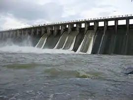 The Rajanganaya Dam (also sometimes called Rajangana) is an irrigation dam built across the Kala Oya river, at Rajanganaya, bordering the North Western and North Central provinces of Sri Lanka. The main concrete dam measures approximately 350 m (1,150 ft) and creates the Rajanganaya Reservoir, which has a catchment area of 76,863.60 hectares (189,934.1 acres) and a total storage capacity of 100.37 million cubic metres (3,545×106 cu ft).[1]