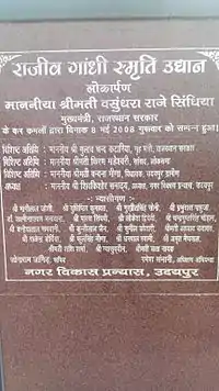 Rajiv Gandi Garden was built and inaugurated on 8 May 2008 by political leader Vasundhara Raje. It was built in memory of Late Rajiv Gandhi, who was the youngest Prime Minister of the Nation. This garden has beautiful fountains, trees and greenery, many statues depicting wildlife and animals throughout the garden, showing importance of plants, wildlife and conservation of water. It gives an impression of Mysore's Brindavan Garden. Besides this, there are numerous other attractions nearby like Sanjay Garden, Shilpgram, Fateh Sagar, Saheliyon-ki-Bari etc.