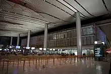 RGIA has an integrated passenger terminal, which covers 379,370 m2 (4,083,500 sq ft) and has a capacity for 34 million passengers per year.[40] The western side of the terminal handles international flights while the eastern side is for domestic operations.[41] There are 46 immigration counters and 96 check-in desks with 19 kiosks for self check-in.[42] There is a total of nine gates, seven of which are located on the south side of the terminal and the other two on the north side. Three gates are each equipped with two jetways to accelerate the handling of widebody aircraft. Public lounge facilities are provided by Plaza Premium Lounge, which operates three lounges in the terminal; there are also three separate lounges for VIPs.[43] The pre-security "airport village" is a meeting point for passenger pick-up.[41]