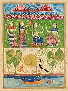 Malwa school of painting, because of its unpretentious appearance, had been designated 'Primitive Rajasthani'. In one of the earliest known examples of the style, Rasikipriya manuscript dated 1634, "backgrounds are plain blocks of colour; a patch of sky hangs at the top of the work, with a broad white band indicating the horizon line. Figures and a tree are often set against the monochrome ground; in rare instances a richer background is created with tall and decorative trees."[7] Despite their 'primitive' appearance, the illustrations are indicative of a well-established tradition. Future stylistic evolution of this idiom is displayed in Ramayana manuscript of c. 1640 and Ragamala of c. 1650. In manuscript of Amaru Shataka from 1652 emerge another strain of Malwa painting, which in its delicate faces, gentle movements and subdued colors show Mughal infuence. These two strains of Malwa school infleunced each other in the succeeding decades. Illustrations of the Rasabeli (c. 1670; N. Mus., New Delhi, MS. 51.63/1–25) painted by Sukhadeva in old Malwa style nevertheless show clear influence of a new idiom. The so-called "Narsyang Shahar Ragamala", dated 1680 (N. Mus., New Delhi) and painted by Madho Das, is one of the most important works in a new style, which at this stage achieved its apogeum. Malwa tradition declined in the 1690s but nevertheless left a mark on painting of the neighbouring regions.[7]