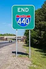 The original I-440 designation used "inner" and "outer" labels rather than east and west labels because the freeway made a full loop around the city. "Inner" was used to designate the clockwise direction around the beltline, and "outer" was used to designate counterclockwise.[32] In 2008, State Highway Administrator W. F. Rosser asked the US Department of Transportation to remove the I-440 designation from the southern portion of the beltline, where it was cosigned with I-40. This decision was primarily made to prevent confusion of travelers who used the highway. On November 10, 2008, I-440 was officially truncated on the western end at the I-40/US 1/US 64 interchange in western Raleigh and at the I-40 interchange in southeast Raleigh. The inner and outer labels were also dropped and replaced with east and west designations.[33][34] The Federal Highway Administration route log has been updated to show the shortened distance.[1] By 2010, the entirety of the highway's signs had been changed to the new designation.[35]