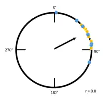 The example to the left is a Raleigh plot that has a high r value. Blue and yellow dots indicate individuals from different groups being tested, and the position of the dots indicate in which angle from magnetic north each tested individual is traveling. Due to the high overall concentration of individuals going at an angle between zero degrees and ninety degrees, the mean vector is much longer. Compare the figure to the left with the figure below:
