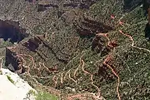 Recognizing the Grand Canyon's potential for tourism, Cameron and his brother built a hotel at the head of the Bright Angel Trail and began charging a toll for use of the trail.[6] The trail, which probably began as a game trail, had been improved by Berry, Niel Cameron, and others (the level of Ralph Cameron's involvement is unclear). Berry filed paperwork to establish it as a private toll road in February 1891. The trail saw little traffic and fell into disrepair by 1897.[9] In either 1901 or 1902, Cameron obtained Berry's rights to the trail. Cameron received a five-year extension to the original ten year right to collect tolls, extending his franchise on the trail til 1906.[10] He also began filing strategically placed mining claims, owning 39 such claims by 1907.[11] Among the claims were the Wizard, which was located at the point where the trail reached the Colorado River, the Alder and Willow mill sites which controlled Indian Garden along with a nearby spring, the Magician claim which contained the trail's most demanding section, the Devil's Corkscrew, and Gold Eagle and Cape Horn claims at the top of the South Rim and containing Cameron's hotel along with the trail head.[12]