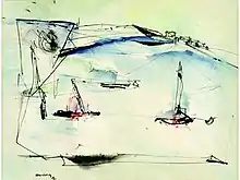 His early work obscured the natural forms that inspired them making critics see them as tending toward pure abstraction. In the early 1950s he made a transition to a more clearly figurative expression.[45][47] These late works were said to give off an air of mystery.[44] Writing of a solo show held at the Landry Gallery in October 1960, Stuart Preston of the New York Times said, "The essence of mystery and magic is exactly what distinguishes Ralph Rosenborg's meditative semi-abstract landscape water-colors... These are rapturous little acts of visual and manual concentration at first sight inscrutable and then revealing themselves to be precise and allusive.[49] Writing about the same show, Bennett Schiff, critic for the New York Post, said "A mystical intensity and a beauty which burns in ruby and sapphire colors are in these fine paintings."[55]