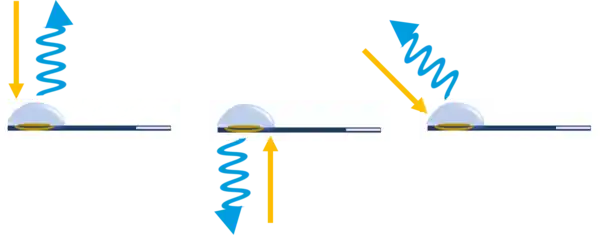 - Normal configuration. The laser beam samples the electrode/solution interface in a normal way respect to the electrode surface. [1][4] The scattered radiation is collected, and the monochromator allows passing only the light beam with wavelengths different from that of the laser used.